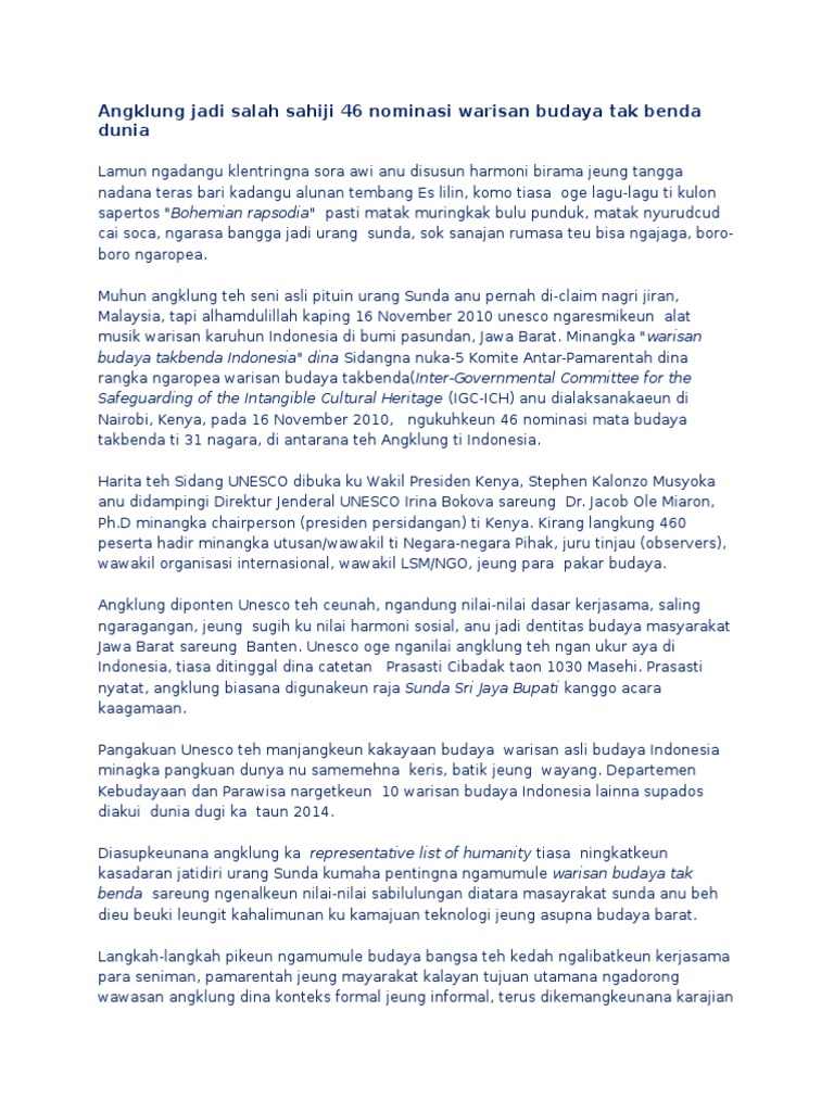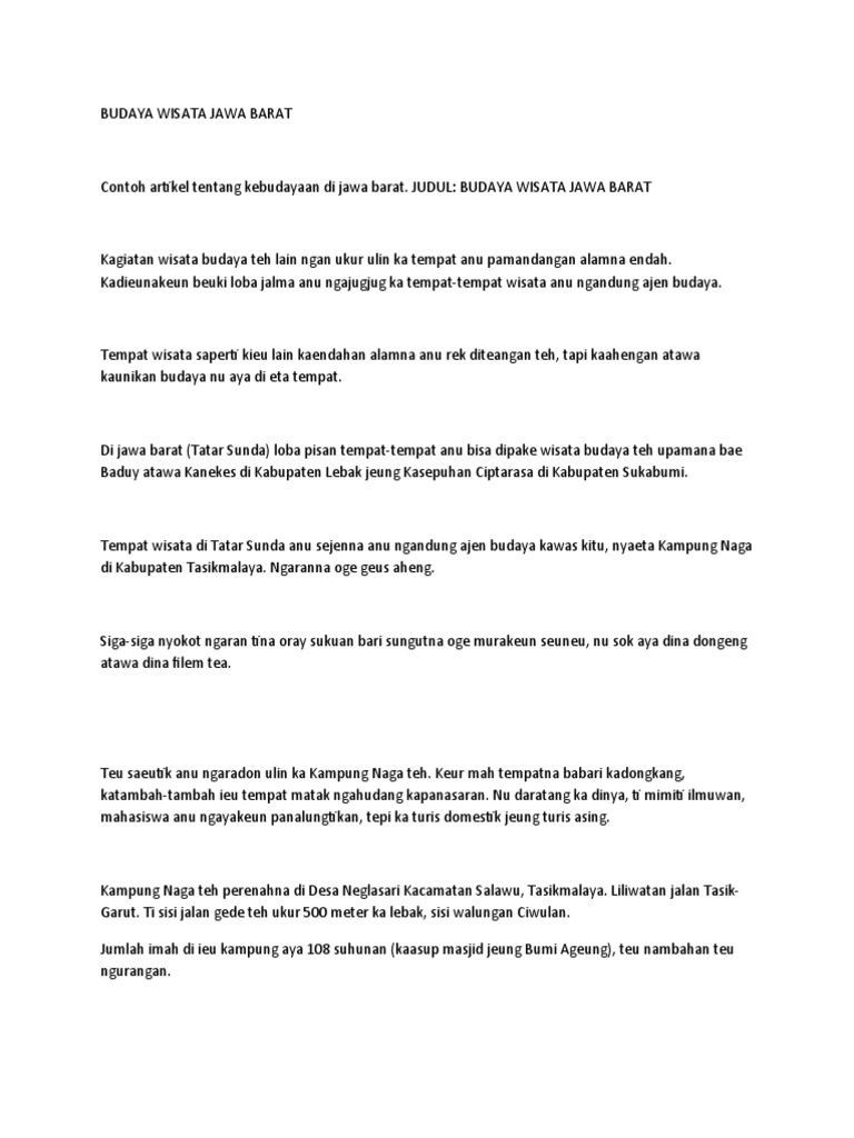 Contoh Artikel Sunda Tentang Budaya : Artikel Sunda Tentang Budaya / Ngawanohkeun seni budaya sunda bisa dimimitian ku népakeun basa sunda jeung rupaning kamonésan basa sunda dina ajén sastra, anu nyampak dina eumpaka lagu, sajak, carpon, jeung sajabana.